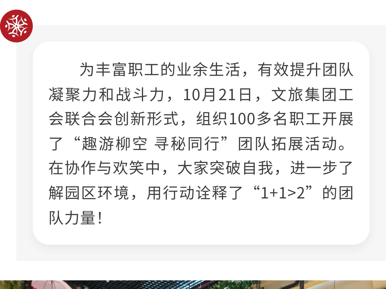趣游柳空,尋秘同行!文旅集團開展團隊拓展活動,玩出滿滿凝聚力 發(fā)布時間:2025年10月23日 10時來源:本站原創(chuàng)瀏覽:41 人次