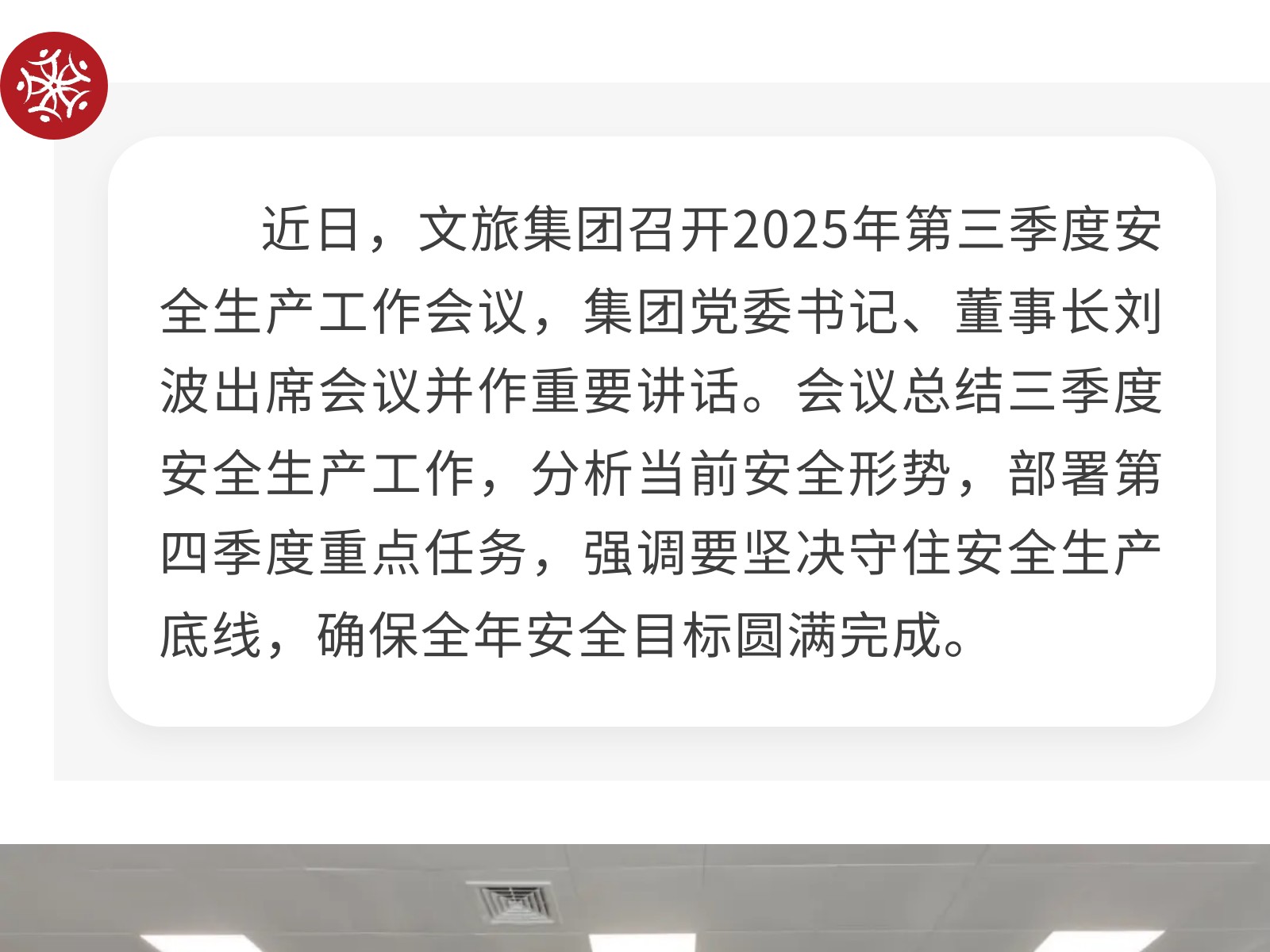 【壓實(shí)責(zé)任 筑牢防線】文旅集團(tuán)全面部署2025年第四季度安全生產(chǎn)工作 發(fā)布時(shí)間:2025年10月24日 10時(shí)來源:本站原創(chuàng)瀏覽:50 人次
