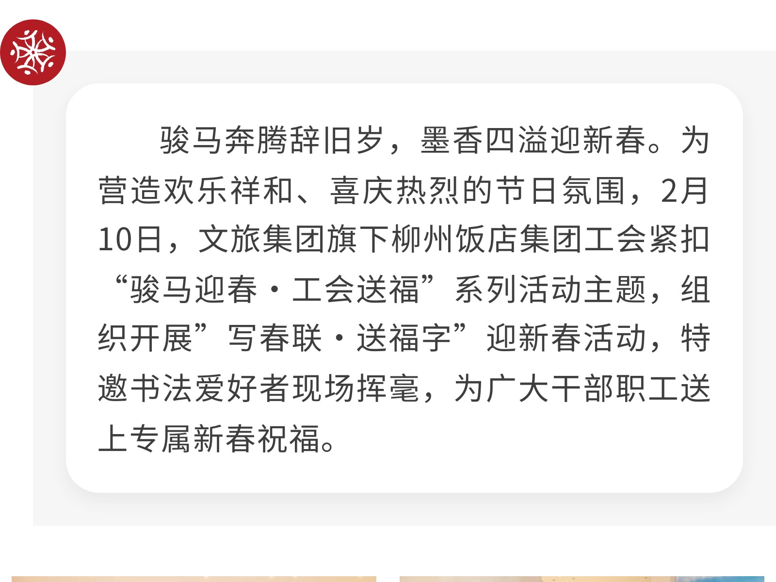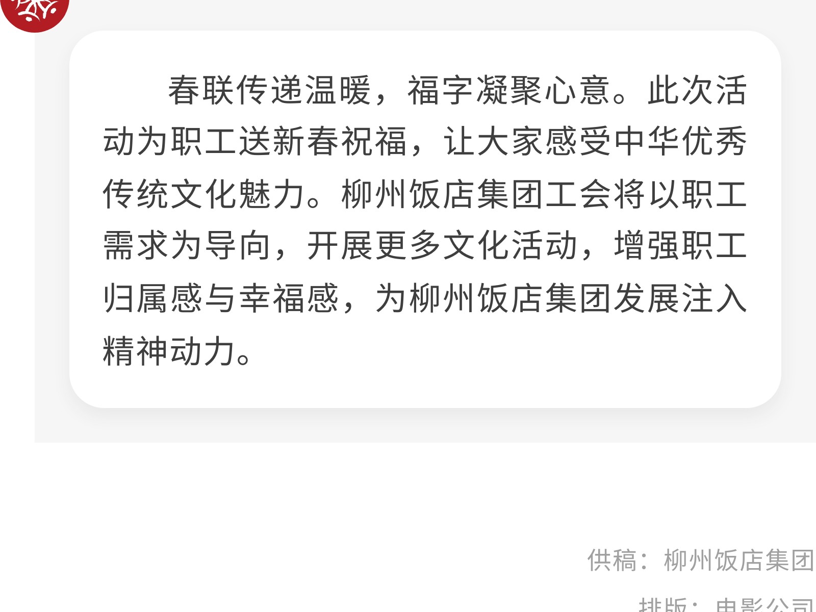 筆墨迎新春 福聯(lián)暖人心——柳州飯店集團(tuán)開展“寫春聯(lián)·送福字”迎新春活動 發(fā)布時間:2026年02月13日 13時來源:本站原創(chuàng)瀏覽:15 人次